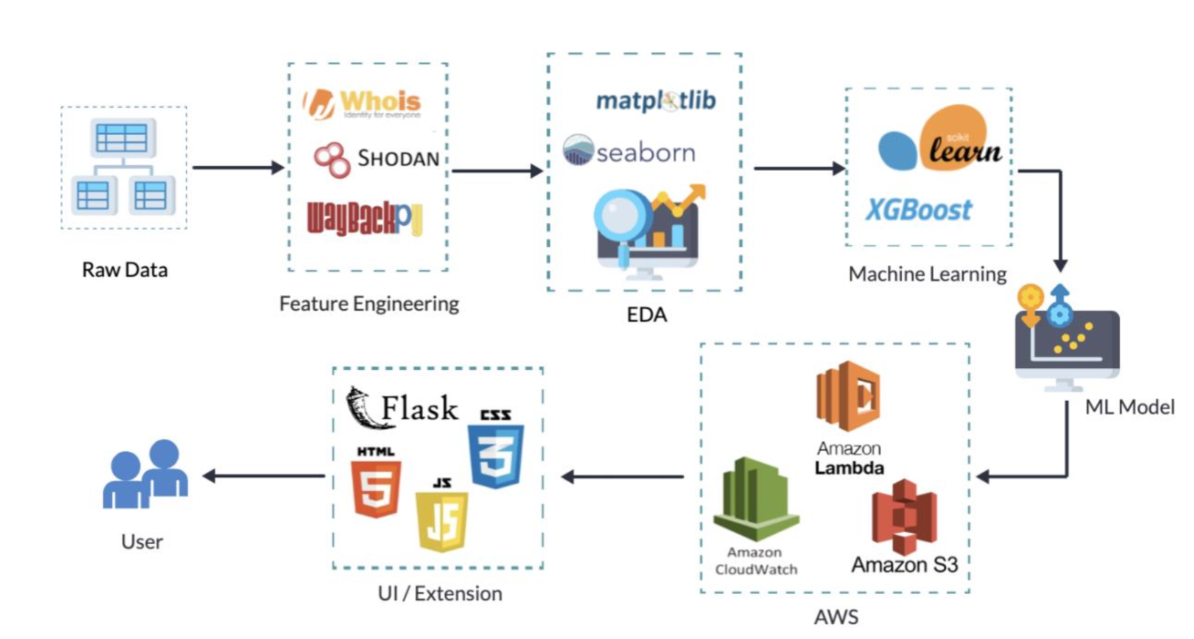 - Tech Stack: Google Colab, Python (pandas, matplotlib, seaborn, scikit-learn), AWS Services, Flask, HTML, CSS, JS)