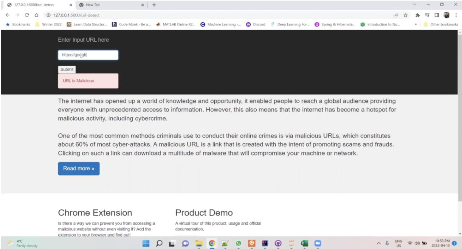 - Attained an effective way to detect malicious URLs, that comprise 60% of all cyber-attacks